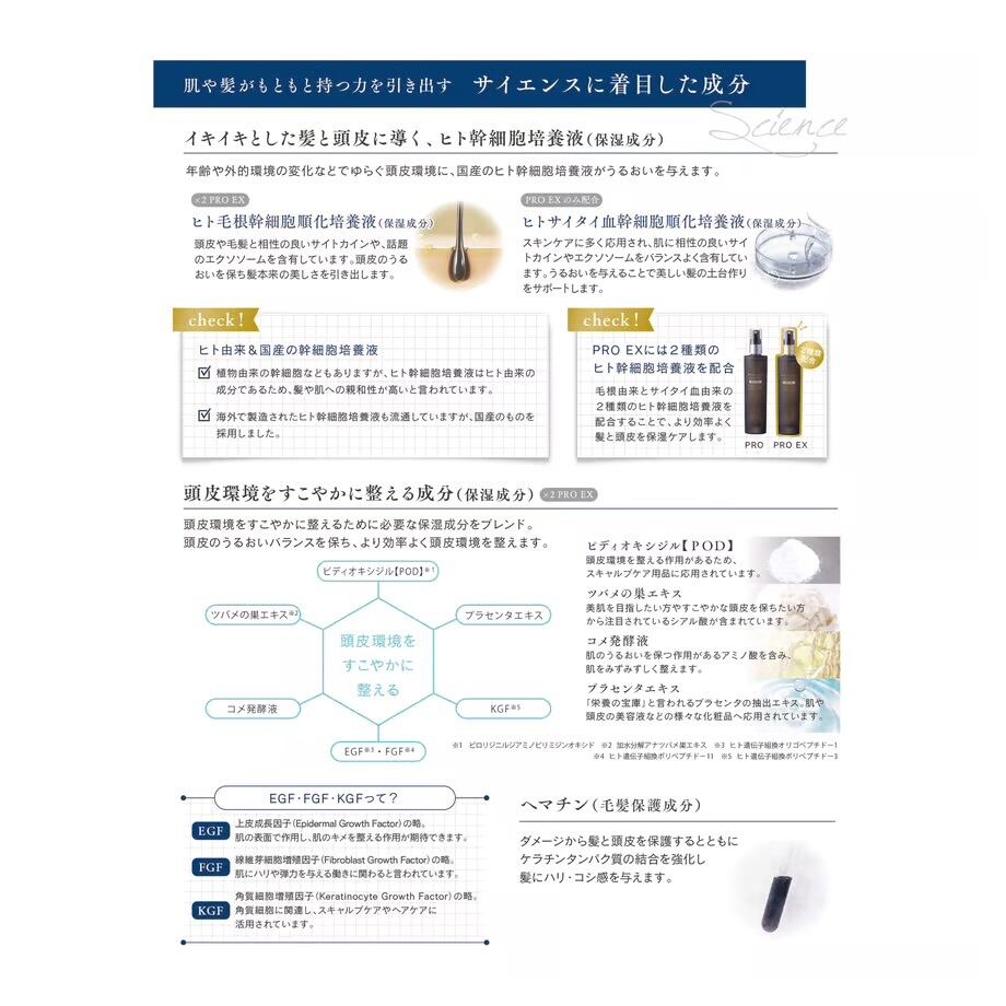 スキャルプサプリ PRO EXはこれらの成分をスキャルプサプリ PROの2倍配合するとともに、うるおいを与え美しい髪の土台作りをサポートする