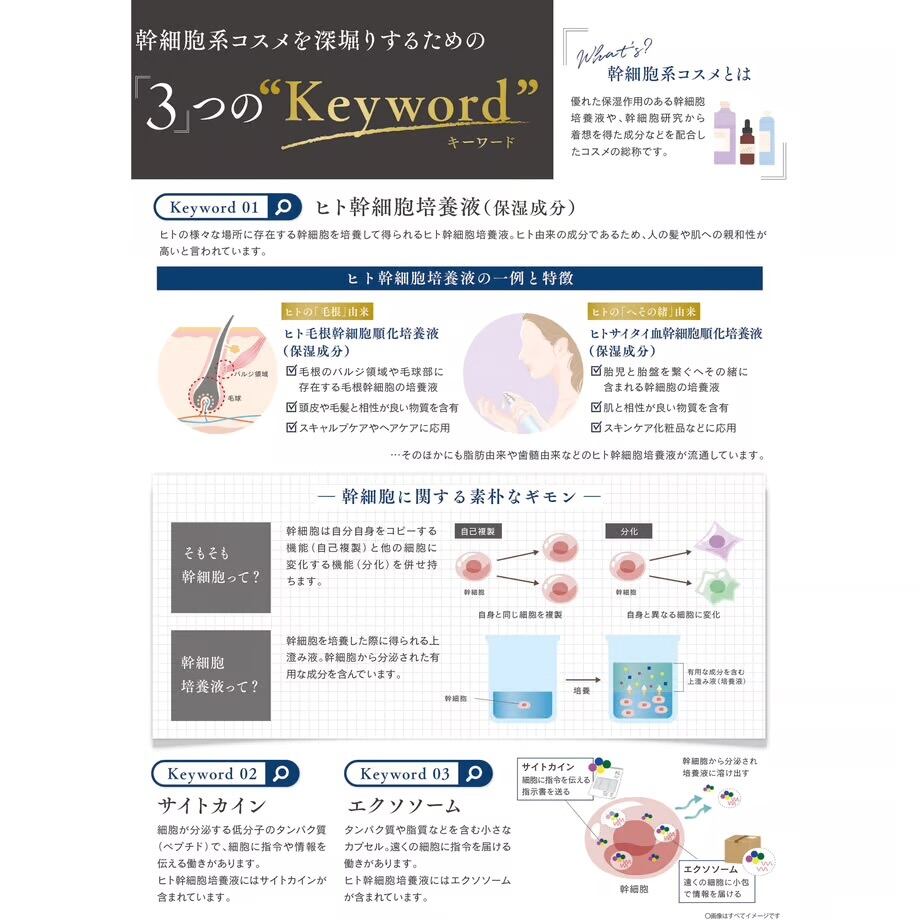 ヒト幹細胞培養液の中でも髪と頭皮に相性が良い、ヒト毛根幹細胞順化培養液(保湿成分)を新たに配合。頭皮にうるおいを与え、髪本来の美しさを引き出します。また、21種類の植物美容エキス(毛髪保護・保湿成分)やC.I.C.A.エッセンス※1(保湿成分)